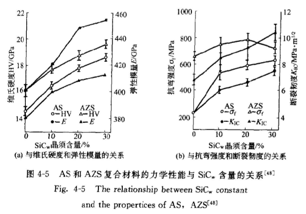 加入30%(體積分數)SiC、可使可從純Al1O的235MPa提高到634MPa。加入20%(體積分數)2Y-ZrO2顆粒可進一步提高AS材料的抗彎強度,但此時SiCw的補強作用則遠低于在AS材料中,而且在SiC、含量為20%(體積分數)時AZS材料的0達達最高值784MPa,隨隨后進一步提高晶須含量反而下降AS和AZS材料料的斷裂韌度均隨SiC含量的增加而連續提高,并且AZS材料度Kc的提高幅度略大于AS材材料。
