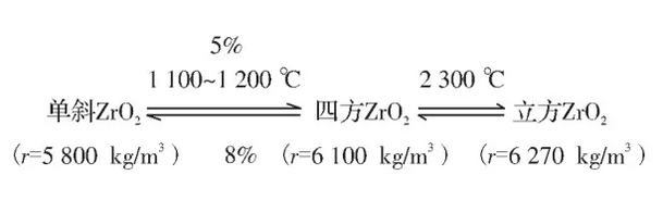 二氧化鋯還具有馬氏體相變的特性, 這是二氧化鋯被用來提高陶瓷材料的韌性和耐火材料熱震穩(wěn)定性的重要依據(jù)。單斜二氧化鋯不能直接用來制造制品,在溫度發(fā)生變化時(shí)會(huì)產(chǎn)生相結(jié)構(gòu)的轉(zhuǎn)變: